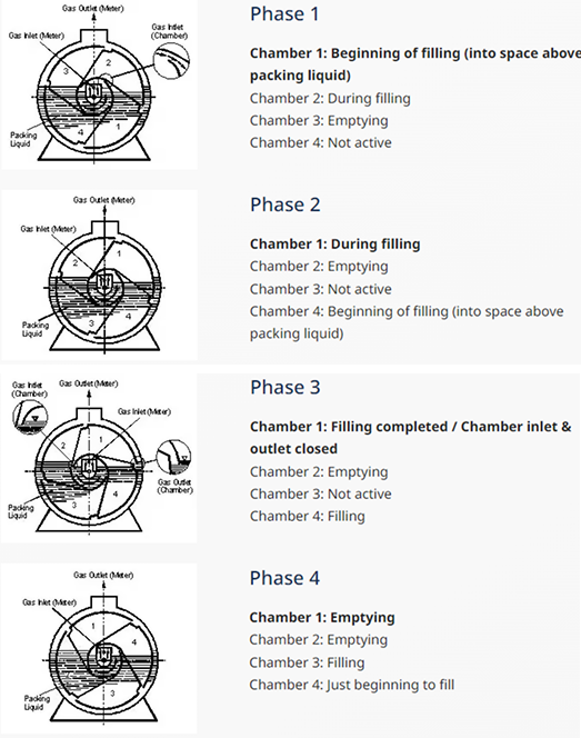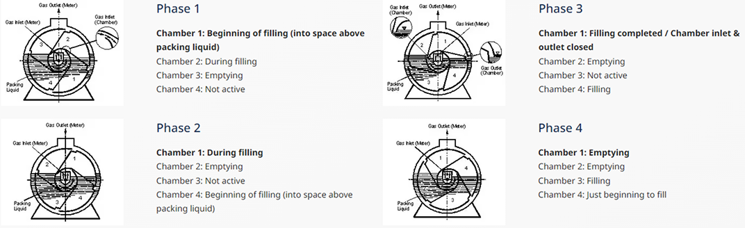 RITTER 드럼형 가스 계량기의 측정은 변위 원리에 따라 작동합니다. 가스 계량기는 포장 액체(보통: 물 또는 저점도 오일) 내에 회전하는 측정 메커니즘(측정 드럼)을 포함합니다. 측정 드럼은 4개의 단단한 측정 챔버를 주기적으로 채우고 비워서 강제로 부피를 측정합니다.