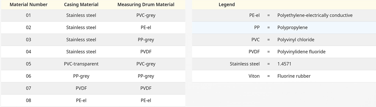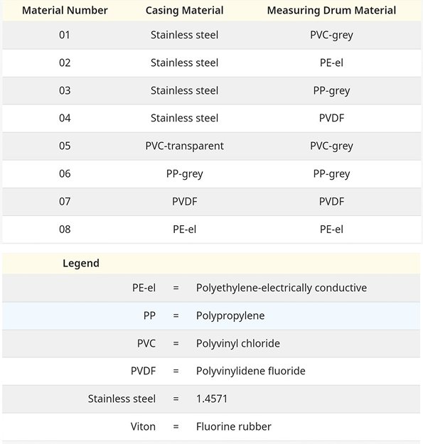 폴리염화비닐(PVC), 폴리프로필렌(PP), 폴리불화비닐화물(PVDF), PE-el(전기 전도성 폴리에틸렌) 또는 정제된 스테인레스 스틸 1.4571(316Ti) 등 5가지 우수한 재료 중에서 가스 계량기 재료를 선택할 수 있습니다. 매우 공격적인 가스의 경우에도 측정 요구 사항을 개별적으로 충족할 수 있습니다.